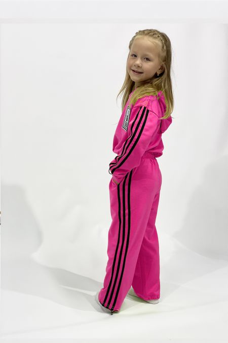 Дитячий костюм Agonwear fuchsia костюм складається з двох частин: худі та штанів, виготовлених із м'якого і комфортного матеріалу (трикотаж двунитка 85% бавовна 5%еластан) кольору фуксія . Худі має капюшон, регульований шнурок на талії та декоративний нашивок на грудях. Рукави та боки худі прикрашені чорними смужками, що додають стилю. Штани мають еластичний пояс та зручні кишені, також з чорними смужками по боках. Костюм підходить для активного відпочинку та занять спортом, забезпечуючи свободу рухів та комфорт.